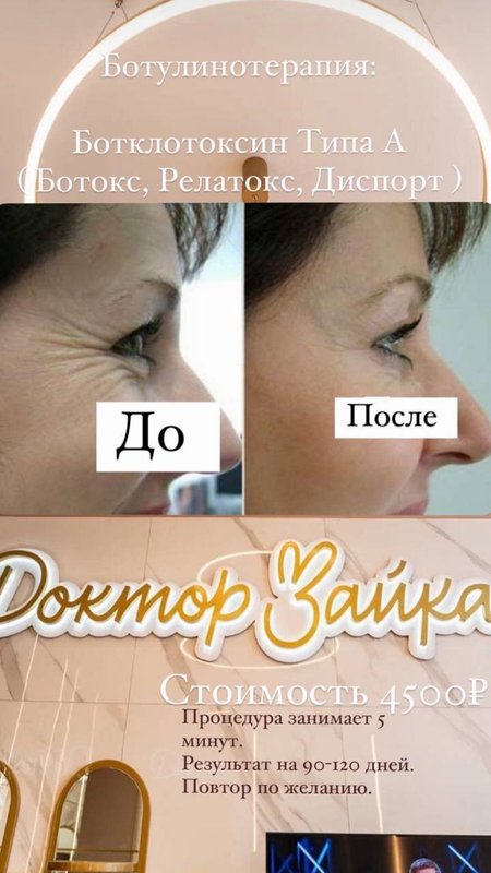Очень довольна профессионализмом и работой с клиентом в клинике косметологии Доктор Зайка. Доктор - дипломированный специалист, который внушил мне доверие после длительного выбора косметологических салонов. После процедуры ботулинотерапии мне дали рекомендации, в том числе воздерживаться от алкоголя и некоторых таблеток, что я соблюдала. Я осталась очень довольна и обязательно приду еще раз.
