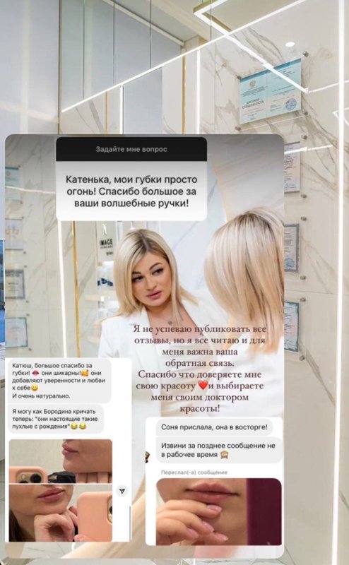 Мне все понравилось: от приветливой девушки-администратора до доктора Екатерины. Я очень довольна качеством ее работы! В последний раз Екатерина делала мне губы, и результат мне очень понравился, я обязательно приду еще. Кроме того, я регулярно делаю у Екатерины уколы ботокса. Мне также очень нравится результат, и я хожу с ним уже довольно долго. Екатерина — замечательный человек. Она располагает к себе, с ней очень легко и не хочется уходить.