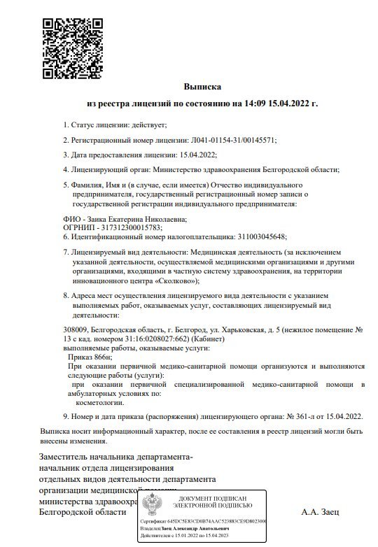 Профессиональное мастерство доктора Зайки и её приятное общение мне очень понравились. Она очень хороший врач. Доктор всё объясняет, показывает и комментирует, поэтому во время процедур чувствуешь себя легко, как дома. Я обратилась, чтобы сделать процедуры по уходу за лицом и пилинги. Сама клиника мне тоже очень понравилась.