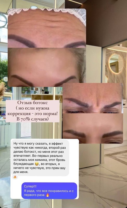 Результат от ботокса меня полностью устраивает и даже превзошёл ожидания - очень нравится! Обслуживание было просто замечательным, оставило только приятные впечатления. Всё выполнено безупречно, никаких неприятных моментов не было, специалист работал замечательно. Мои подруги с восхищением замечают изменения в моём лице - для меня это лучшая похвала.